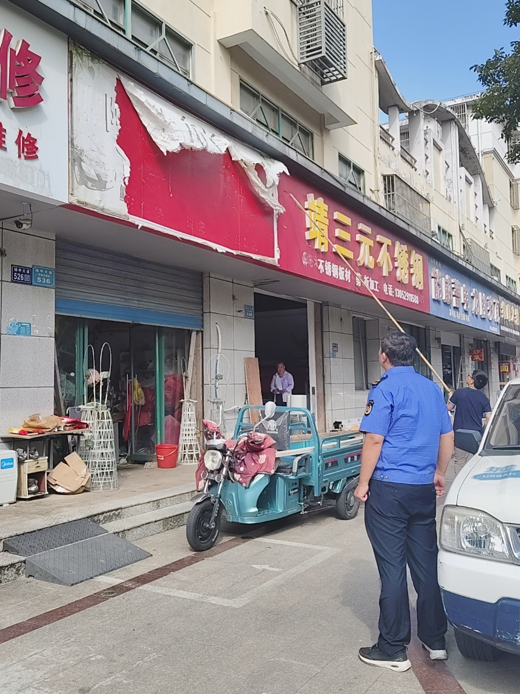 行动前期,市城管局坚持“规范管理、安全第一”原则,组织执法队员对城区主次干道、商业街区等重点区域的户外广告及店招标牌,特别是因使用年限较长导致的结构老化、钢架锈蚀、字体脱落、版面破损等问题的广告标牌进行细致排查。同时开展入户宣传,通过政策解读、案例警示等方式,明确整改标准,增强安全意识。4月份以来,共排查路段22条,下发整改通知书30余份,清理横幅20余条,劝导商户自行整改户外广告16处。